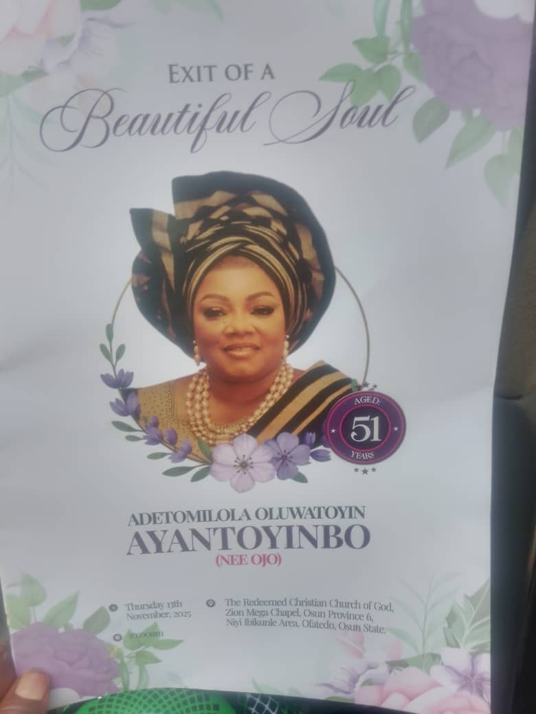 The remains of the Royal Tripple Boss of Osogbo, Late Mrs. Adetomilola Ayantoyinbo Ojo, who departed this sinful world on November 3rd, 2025, have been committed to mother earth at Park Garden, Ilesha Road, Osogbo, on Thursday.