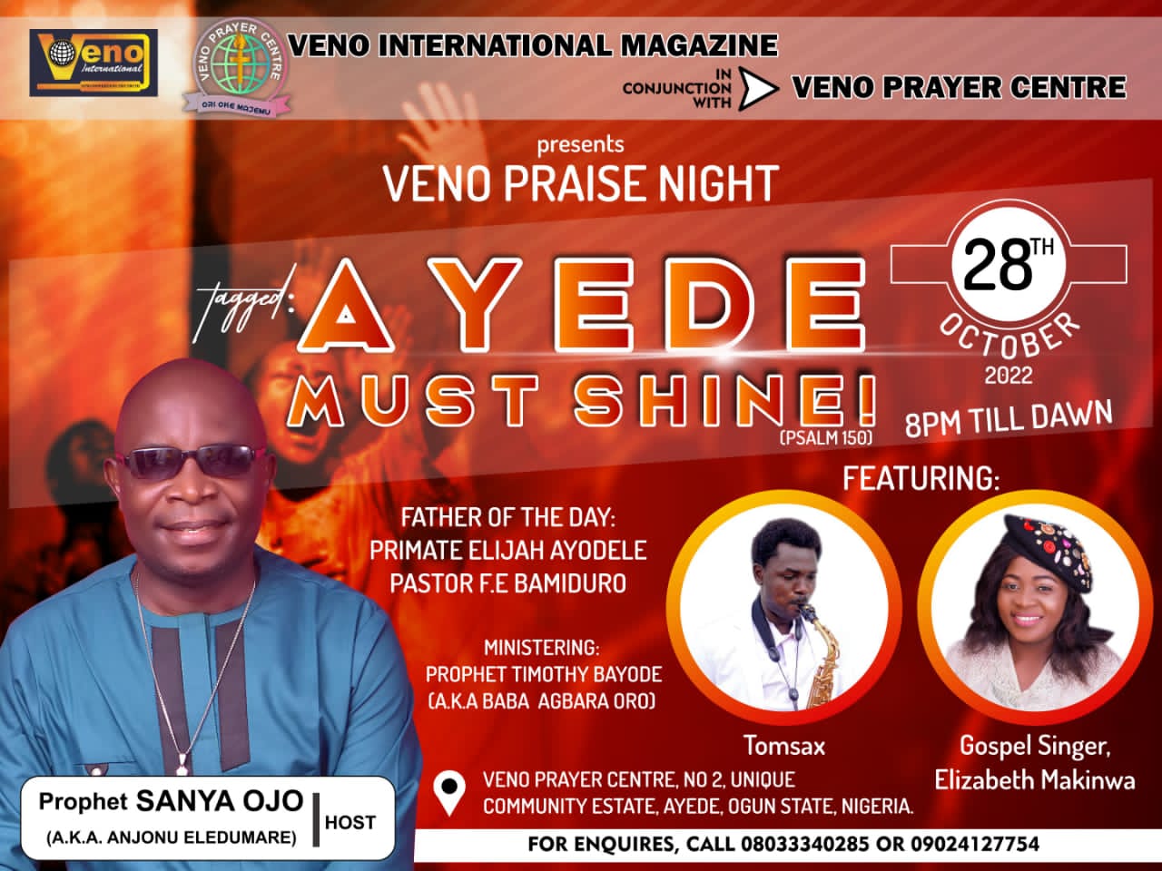 The leader of INRI Evangelical Ministry, Primate Elijah Ayodele, Dr Lawrence Ayodele, Pastor F.E.Bamiduro and Olukere of Ikere Ekiti, Oba Ganiyu Obasoyin have backed Veno Praise Night slated for October 28th, 2022 at Veno Prayer Centre a.k.a Ori Oke Majemu in Ogun State, Nigeria..