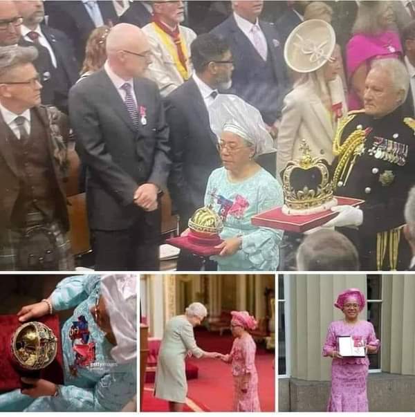 She carried the Orb at the King's coronation and was spotted wearing a very lovely turquoise Nigerian outfit of blue lace shirt and skirt and a white ulari.
