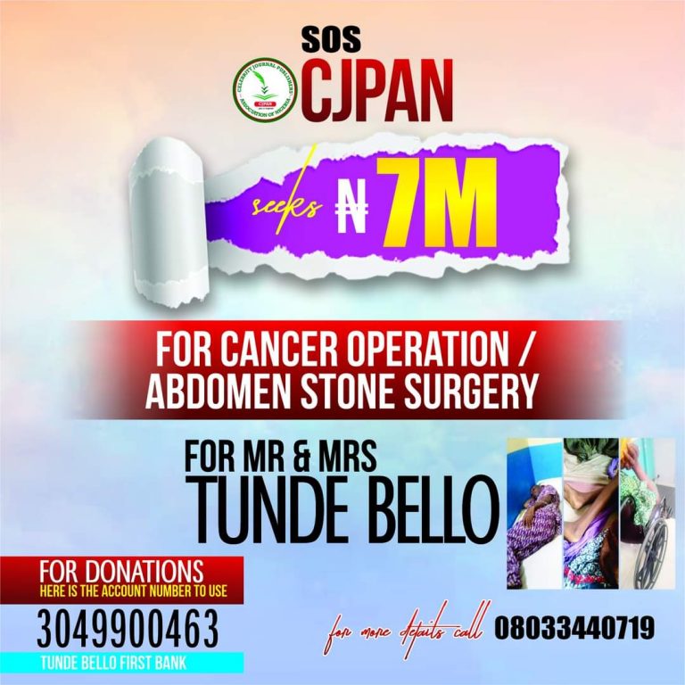 Veteran Journalist and Publisher Global Times Magazine/online and Ifako Ijaiye Post, a community newspaper, based in Lagos Mr. Tunde Bello is in urgent need of N7m for his wife’s Cancer operation and your little donations goes a long way.